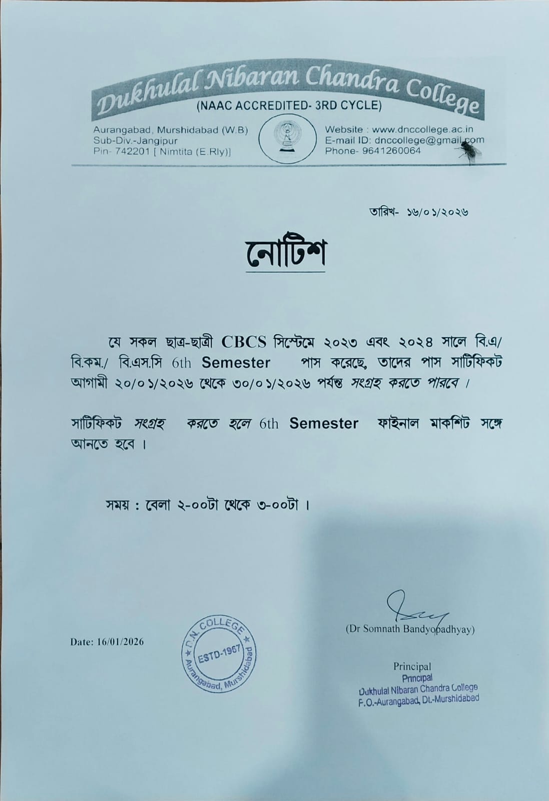 Notice for 6th Semester Pass Certificate issue U.G Exam -2023 and 2024 (CBCS)